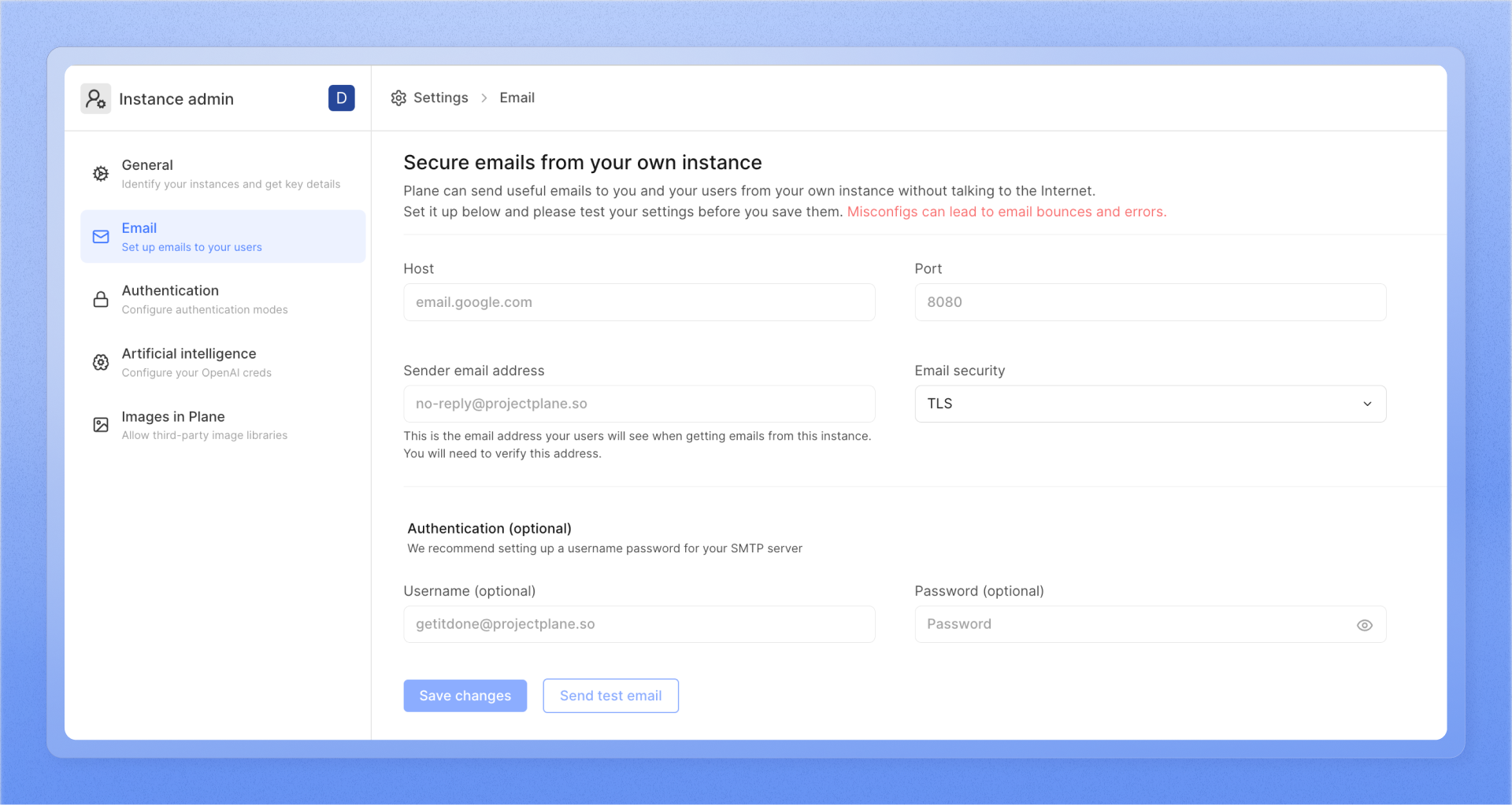 Plane currently supports SMTP authentication only via email and password. OAuth-based SMTP configurations aren’t supported.